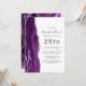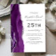 The left-hand edge of this elegant modern wedding anniversary party invitation features a purple watercolor agate border trimmed with silver faux glitter. The customizable text combines charcoal gray handwriting, copperplate and italic fonts on a white background. The reverse side features a matching purple and silver agate design.