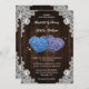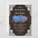Rustic purple and blue floral wedding invitation featuring two heart-shaped hydrangea flowers on a barn wood background adorned with white floral lace. Perfect card design for inviting your guests to your purple and blue rustic wedding party.