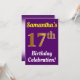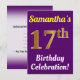 Ce design d’invitation à la fête d’anniversaire comporte un message comme "17e anniversaire de Samantha!", où le nom peut être personnalisé, et où le numéro "17e" a une apparence fausse or. Il est également décoré d'un arrière - plan violet. Les détails de l'événement sur le dos peuvent être personnalisés. Il pourrait être utilisé pour invitation des gens à la fête du dix-septième anniversaire ou à la fête d’anniversaire de quelqu’un. [~Z0000121]