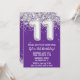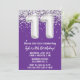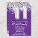 Purple and silver 11e invitation anniversaire 11 invitation fête d'anniversaire pour un noir blanc argenté avec écriture de script moderne et ballons de papier d'aluminium amusant.