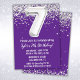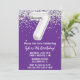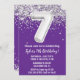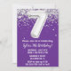 Purple and silver 7e anniversaire invitation de fête 7 anniversaire invitation de fête avec parties scintillant et écriture de script moderne et ballons de papier amusant.