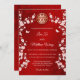 Branches de fleurs de cerisier rose poussiéreux, deux papillons et un double symbole de bonheur doré sur un arrière - plan rouge. Avec un code QR scannable à l'arrière.