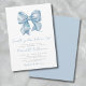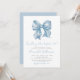 Quelque Chose De Bleu Avant Moi ! Élégante invitation à la douche nuptiale Bleue Bow. Ce design charmant présente une fine arbalète bleu aquarelle en haut, associée à la phrase "Quelque chose de bleu avant moi !" dans un mélange sophistiqué de polices bleues et grises. Le texte combine le serif classique et l’élégante calligraphie de script, créant un look intemporel et moderne, parfait pour célébrer la future mariée. Idéal pour les brunchs de douche nuptiale ou les soirées chic, l’invitation est entièrement personnalisable, vous permettant d’ajuster les couleurs et les mises en page de police pour correspondre au style de votre événement. L'arrière est orné d'un arrière - plan bleu doux qui associe le design à une finition fraîche et élégante. Idéal pour les fêtes du printemps et de l'été, cette invitation polyvalente fonctionne à merveille toute l'année et est idéale pour tous les thèmes de la douche nuptiale, des fêtes de jardin aux événements intérieurs confortables. Disponible sous forme de carte imprimée ou de fichier numérique téléchargeable pour l'e-mail ou l'impression locale, ce design ajoute une touche d'élégance raffinée à votre célébration.