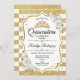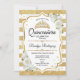 Invitation à la célébration de la Quinceanera blanche en or. Caractéristiques rayures, police de script, roses blanches, tiara et confetti. Design classique avec parties scintillant en or. Parfait pour une élégante célébration de glamour.