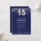 Une invitation moderne, élégante et glamour pour une Quinceañera, 15ème anniversaire. Un arrière - plan bleu marine, décoré de faux étoiles argentées. Personnalisez et ajoutez votre nom et les détails de votre fête. Le numéro 15 est écrit avec une police de style ballon.