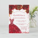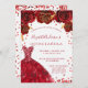 Une invitation moderne, élégante et glamour pour une Quinceañera, 15ème anniversaire. Un arrière - plan blanc aux étincelles, une robe rouge et des roses rouges, des fleurs. Le nom est écrit avec un script de style moderne écrit à la main. Personnalisez et ajoutez les détails de votre fête.