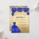 Une invitation moderne, élégante et glamour pour une Quinceañera, 15ème anniversaire. Un faux arrière - plan d'or avec des étincelles de faux bleu et une robe bleue royale et des roses, des fleurs. Le nom est écrit avec un script de style moderne écrit à la main. Personnalisez et ajoutez les détails de votre fête.