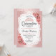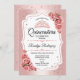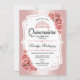 Invitation à la célébration de la Quinceanera en or blanc rose. Caractéristiques police de script, roses rose pâle, tiara et confetti. Design classique avec parties scintillant en or. Parfait pour une élégante célébration de glamour.