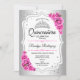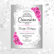 Invitation à la célébration de la Quinceanera en argent noir et blanc. Caractéristiques police script, rose pastel roses, tiara et confetti. Design rose vif et élégant avec parties scintillant en argent. Parfait pour une élégante célébration de glamour.