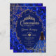 Invitation à la célébration de la Quinceanera en bleu et or royal. En vedette brune fille en robe de robe de bal, police de script, papillons d'or, roses d'aquarelle et tiara. Parfait pour une élégante célébration de glamour de style princesse. Personnalisez avec vos propres détails. Invitations Zazzle imprimées ou téléchargement instantané modèle imprimable numérique.