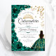Invitation de célébration Quinceanera vert émeraude et or avec une jeune fille brune en robe de bal, police de caractères script, papillons dorés, roses vertes et diadème. Parfait pour une célébration glamour de style princesse élégante. Personnalisez avec vos propres détails. Cartes d'invitation Zazzle imprimées ou modèle de template numérique imprimable instantané.