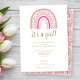 Un mignon 'C'est une fille ! ' Invitation baby shower avec une illustration arc-en-ciel rose et or boho. Le design arc-en-ciel est également disponible au dos de la carte. Customisez avec vos coordonnées pour informer vos invités de votre événement.