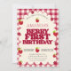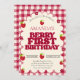 Adorable raspberry-themed 1st birthday invitation featuring a cute smiling berry and watercolor details — perfect for a berry sweet celebration!