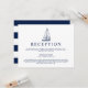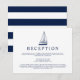 Cartes d'invitation de réception sur le thème nautique représentant un bateau à voile de style vintage et un fond rayé bleu marine et blanc au verso.