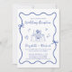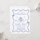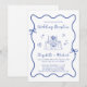 Invitation de mariage d'inspiration française bleue avec un cadre ondulé décalé orné d'arcs de coquette et d'illustrations fantaisistes dessinées à la main de coeurs, d'étoiles et d'une élégante table mariage romantique. "Mariage Réception" et les noms de la mariée et du marié sont présentés dans un scénario bleu ludique.