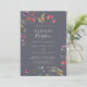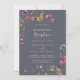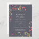 Cette invitation de réception de mariage classique fleuri bleu sauvage est parfaite pour une fête rustique après une fugue amoureuse. Le design présente des fleurs sauvages jaunes, violettes et blanches avec du feuillage sur un fond aquarelle rose et vert.