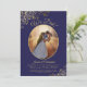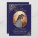 Cette belle invitation de réception de mariage ou d'après-fête présente un titre élégant en écriture cursive indiquant "Nous l'avons fait !". Elle arbore un design simple mais élégant avec des lettres fantaisistes en or sur fond bleu marine, et votre photo dans un cadre ovale entouré de fronces en dentelle de faux feuille métallisée. Parfait pour les mariages discrets ou les célébrations qui ont lieu après une cérémonie privée. Un excellent moyen d'inviter votre famille et vos amis à célébrer votre amour.