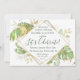 Cette invitation de réception de mariage sur le thème tropical élégant présente un feuillage exotique avec des accents dorés. Un cadre géométrique moderne doré met en valeur le texte vert foncé. Des éclaboussures d'or accentuent le design botanique et apportent une touche de fantaisie sophistiquée à l'invitation. C'est l'annonce de mariage et l'invitation à la réception parfaite pour tout mariage sur le thème tropical.