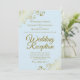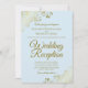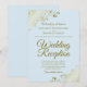 Cette invitation simple est conçue pour les invités à la réception mais pas à la cérémonie de mariage elle-même. Elle présente un design élégant et stylé avec des lettres en écriture dorée fantaisiste sur un fond bleu poudre pâle et des volutes et des fioritures en faux feuilletis dorés ornés dans les coins. Belle façon d'inviter vos amis et votre famille à célébrer avec vous !