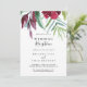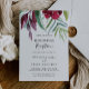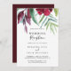 Cette invitation de réception de mariage floral tropical calligraphié est parfaite pour une fête rustique après un mariage intime. Ce design enchanteur peint à la main présente de précieuses fleurs bordeaux, violettes et du feuillage vert soigneusement disposés en bouquets élégants.