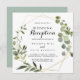 Cette invitation de réception de mariage géométrique or tropical vert est parfaite pour une simple fête après l'élopement. Le design présente de belles feuilles vertes peintes à la main, ornant un cadre géométrique doré.