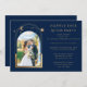 Faire-part de réception de mariage Astronomie Lune Soleil Or Bleu Happily Ever After Mystique comprend un soleil, une lune et des étoiles dorés avec un cadre doré sur fond bleu avec votre photo préférée à l'intérieur. Personnalisez avec les informations de votre réception de mariage. Disponible en invitation papier physique et en invitations numériques imprimables en téléchargement instantané. Conçu pour vous par Evco Studio www.zazzle.com/store/evcostudio