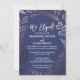 Cette carte d'invitation de réception de mariage intime élégant en rose gold et bleu marine est parfaite pour une fête d'élopement classe. Le design présente un magnifique cadre feuillu rose pâle sur fond bleu foncé et est associé à une police cursive étincelante. Les cartes de RSVP sont vendues séparément.