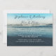 Faire-part de mariage avec scène d'océan bleu combiné à une invitation à une réception pour les jeunes mariés. Les cartes horizontales ont une vue sur la plage, avec des vagues qui se brisent, comme arrière-plan pour le texte personnalisé. Un script noir en haut pour les noms et "M. et Mme" avec un texte imprimé blanc en bas pour inclure la date et le lieu de la cérémonie privée ainsi que les informations d'invitation. Couleurs bleu profond de la mer. Si vous modifiez les formats de papier, assurez-vous que tout votre texte rentre et soit imprimé loin des bords du papier.