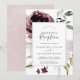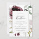 Cette invitation de réception de mariage romance florale est parfaite pour une fête élégante après une fugue amoureuse. Le design bohème rustique moderne présente des fleurs aquarelles romantiques dans des tons doux de bordeaux, mauve, rose blush et blanc crème avec des feuilles vertes. Les cartes de RSVP sont vendues séparément, ou vous pouvez ajouter les informations de RSVP au verso de la carte.