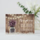Cartes de réception de mariage rustique avec guirlandes de lumières et fleurs de lavande et baby's breath dans des jarres en verre.