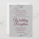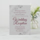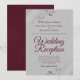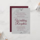 Cette invitation simple est conçue pour les invités invités à la réception mais pas à la cérémonie de mariage elle-même. Elle présente un design élégant et stylé avec des lettres en écriture burgonde ou bordeaux sur un fond gris et des volutes et des fioritures en faux-foil argenté orné dans les coins. Belle façon d'inviter vos amis et votre famille à célébrer avec vous !
