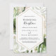 Cette invitation de réception de mariage tropicale en or géométrique est parfaite pour une fête moderne après l'élopement. Le design présente des feuilles de palmier et de bananier peintes à la main à l'aquarelle or et verte avec des fleurs roses regroupées en bouquets, ornant un cadre géométrique.