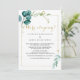 Cette carte de réception en or et en eucalyptus vert est parfaite pour une soirée post-elopement de destination. Le design se compose de feuilles et de fleurs peints à la main en aquarelle vert, or et bleu, soigneusement arrangés en bouquets et cadres géométriques élégants. Les cartes RSVP sont vendues séparément.