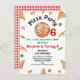 Red Green moderne Any Age Pizza Party Anniversaire Invitation Pizza thème toute invitation d'anniversaire d'âge comprenant diverses tranches de pizza, champignons, basilic et plus ainsi qu'une grande tranche, serviette et planche en bois. Idéal pour une soirée d'anniversaire à la pizza pour enfants.
