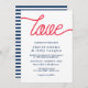 Faire-part de mariage moderne en rouge, bleu marine et blanc. L'amour est écrit dans un grand script rouge cerise au-dessus du texte de l'invitation en bleu. Le dos est recouvert de fines rayures bleu marine et blanc.