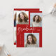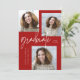 Red Modern Calligraphy Five Photo Graduation Party Invitation présente trois photos sur le devant, ainsi que deux photos et les détails de votre fête de remise de diplômes sur le dos.