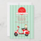 Un design zippy pour une fête d'anniversaire. Le arrière - plan rayé présente une bannière rouge et un scooter rouge et blanc avec un cupcake d'anniversaire. Le cupcake peut être traîné à n'importe quel endroit ou éliminé.