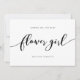 Carte élégante "Seras-tu ma demoiselle d'honneur" avec les mots "fleur" écrits dans une écriture cursive détendue en noir sur fond blanc. La carte a un verso noir avec des lignes blanches qui se chevauchent.