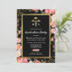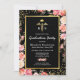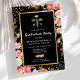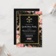 Cartes d'invitation élégantes pour la remise des diplômes d'infirmières avec un fond noir tendance, de jolies fleurs aquarelles roses, une brillance dorée, le symbole médical caducée, et un modèle de fête de fin d'études facile à personnaliser.