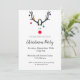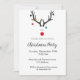 Une tête de renne mignonne, drôle, moderne, minimaliste et abstraite. Arrière - plan blanc. Une invitation à la fête parfaite pour une fête de Noël entre amis, en famille ou entre collègues. Modèles pour date, lieu, RSVP détails. Lettres gris foncé. Dos : baies rouges et feuillage bleu et vert sur un arrière - plan blanc.