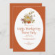 Une invitation à un repas de fête de Thanksgiving conçue avec des feuilles colorées d'automne et une citrouille aquarelle, sur un fond orange vif et blanc avec le texte de l'invitation : date, heure et détails de réponse. Le verso est de couleur orange récolte assortie. Pour personnaliser, remplacez simplement le texte d'exemple en utilisant notre modèle étape par étape.