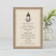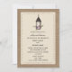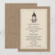 Une invitation à dîner de répétition de mariage monogramme montrant une illustration d'une lanterne remplie d'un arrangement floral avec un schéma de couleur lavande. Personnalisez le texte avec les détails de votre occasion. Arrière - plan est burlap inspiré par la dentelle design sur l'avant.