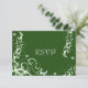 Cette carte de réponse de réception de mariage Green Flourish comporte des volutes et des fleurs blanches fantaisie sur fond vert. Recherchez les faire-part de mariage assortis et les cartons "Save The Date".
