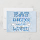 Pigeons avec anneaux de mariage sur fond bleu pastel doux pour RSVP.