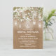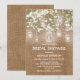 Cartons d'invitation de mariage de campagne avec lumières scintillantes avec un fond effet toile de jute marron rustique, gupe de lumières de jarre de maçon élégantes, fleurs de respiration de bébé et un modèle de cortège nuptial moderne.