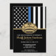 Cette conception présente un drapeau de la force de police avec des bandes noires et blanches, ainsi qu'une fine bande bleue. Le badge de police et le texte doré se trouvent au-dessus de tous les détails de la fête pour la retraite de l'agent de la force de l'ordre, du shérif, du capitaine ou du chef en retraite.