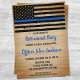 Cartes d'invitation pour la retraite de la police Thin Blue Line ou invitations pour la cérémonie de remise des diplômes de la police. Célébrez des années de service dévoué, ou célébrez votre nouveau diplômé de l'académie de police, et invitez vos amis et votre famille à votre fête d'application de la loi avec cette invitation de retraite de la police rustique en bois avec le drapeau Thin Blue Line et les invitations pour la cérémonie de remise des diplômes de l'académie de police - design de drapeau américain dans les couleurs du drapeau de la police, design en détresse. Cette invitation de retraite pour policier est également parfaite pour les invitations pour la cérémonie de remise des diplômes de l'académie de police, changez le lieu dans la personnalisation. Consultez notre collection pour des cadeaux de retraite de policier assortis, des cadeaux de remise des diplômes de la police, des