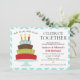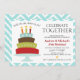 Cool rétro double invitation de célébration d'anniversaire avec le titre "Célébrez ensemble", un gâteau d'anniversaire coloré vintage avec des bougies, le phare "double le gâteau, double le plaisir !", une bordure en chevron et un modèle d'anniversaire facile à personnaliser.