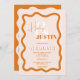 Un cool noms gras faire-part de mariage avec des noms personnalisés avec une calligraphie manuscrite et une police serif, 2 noms, deux styles avec la courbe en terre cuite rétro squiggle photo mariage ondulé. Tous les textes, noms et couleurs arrière - plans sont personnalisables pour vous permettre de mélanger et de correspondre à votre suite mariage.