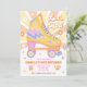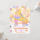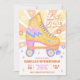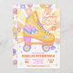 Un design ludique et rétro inspiré du roller dans la palette de couleurs rose pastel, orange, violet et jaune. À l'avant se trouve un roller jaune et le texte "Let's Roll" dans un script rétro avec un soleil éclaté derrière, et à l'arrière est un motif ludique et lumineux de patins à rouleaux. Customisez les détails de votre fête ! Voir l'ensemble de la collection de fêtes de correspondance.